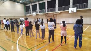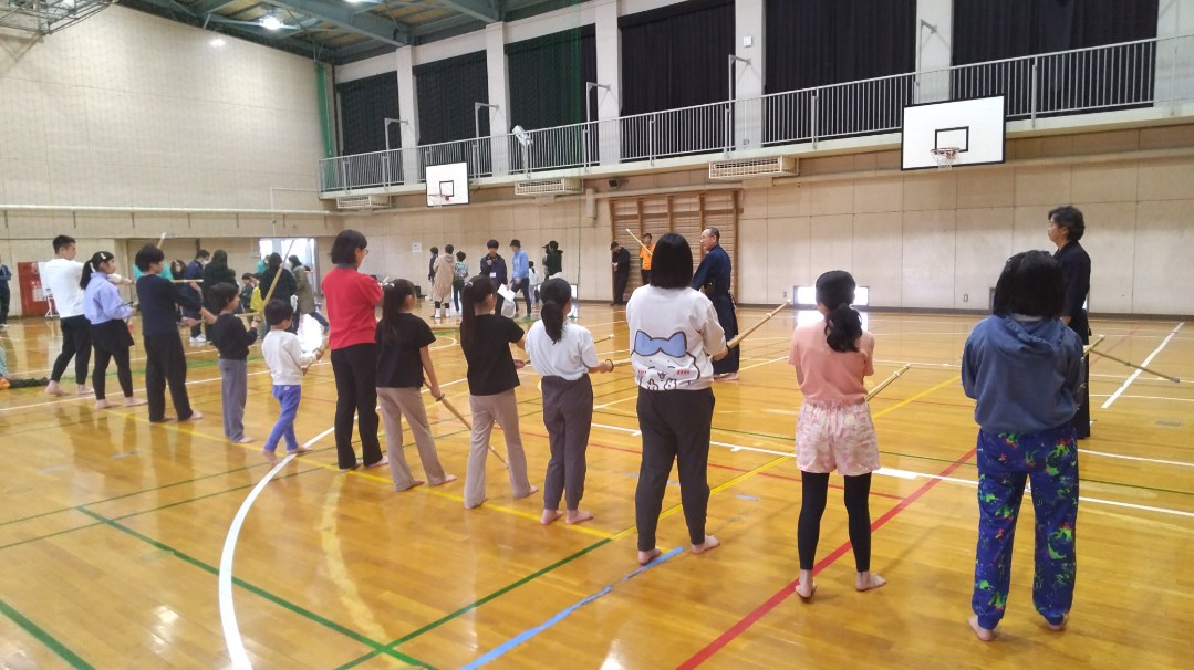22日、大田区スポーツ協会の依頼で、スポーツバイキングで剣道を体験させるコーナーを任されました。45分ずつ2グループに分けて、竹刀の握り方から、足の進め方、打ち方など、やさしく、丁寧に教えました。 全く初めての人も多かったのですが、中には子供のころやってた、という人もあり、それなりに楽しそうに竹刀を振っていました。 以前も、こういうイベントを頼まれたとき、それを機にじゃあ、やってみようという人はほとんどいなかったのですが、今回も、終わってから「アーくたびれた」という声も多かったので、あまり期待はできないようです。 運動量としてはうちの低学年よりすくなめでは有りましたが、初心者にはきつかったのかしら?