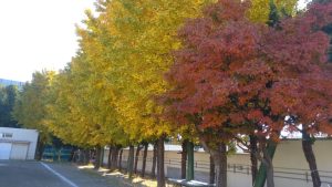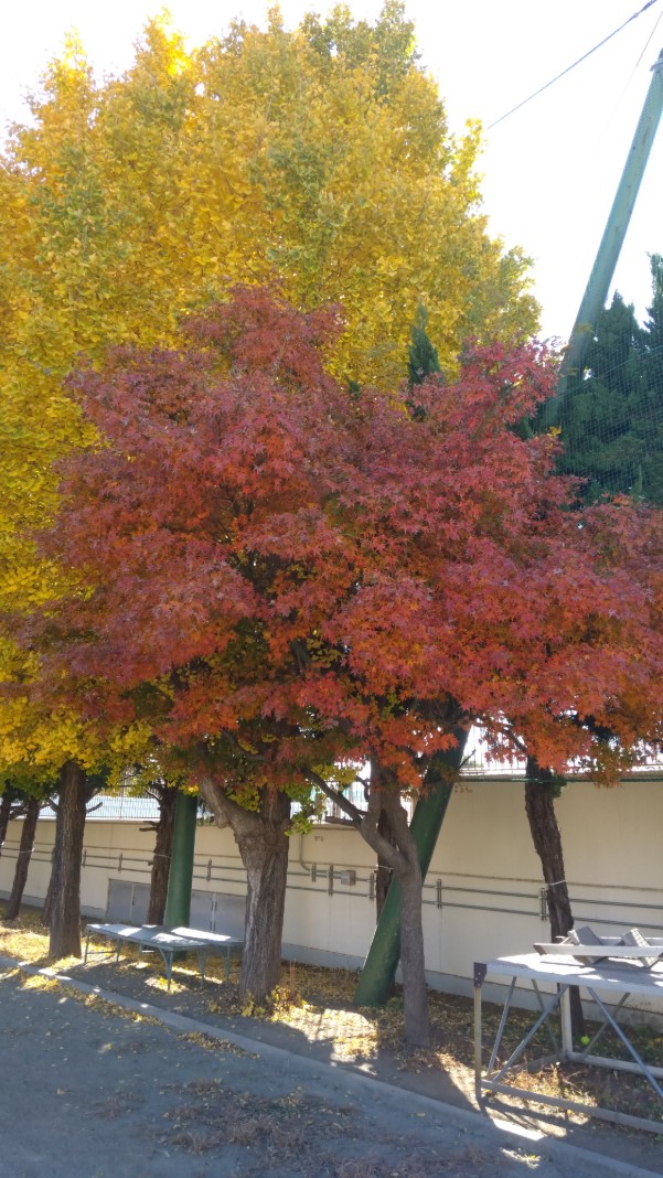 雪中運動場のもみじとイチョウは、まだまだ秋を楽しんでいるようです